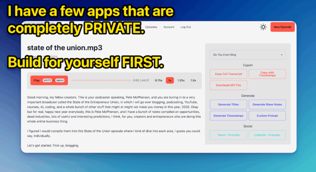 Author bio: Pete McPherson left the corporate world in 2017 to become a full-time online entrepreneur, building 20+ profitable brands, two of which he successfully sold. Over the years, his work has reached millions of people through YouTube, podcasts, and blogs, amassing over 4,000,000 YouTube views and 3,000,000 podcast downloads. Today, Pete teaches creators and entrepreneurs through Code Playbook, his program and YouTube channel dedicated to helping people build and launch apps with AI.